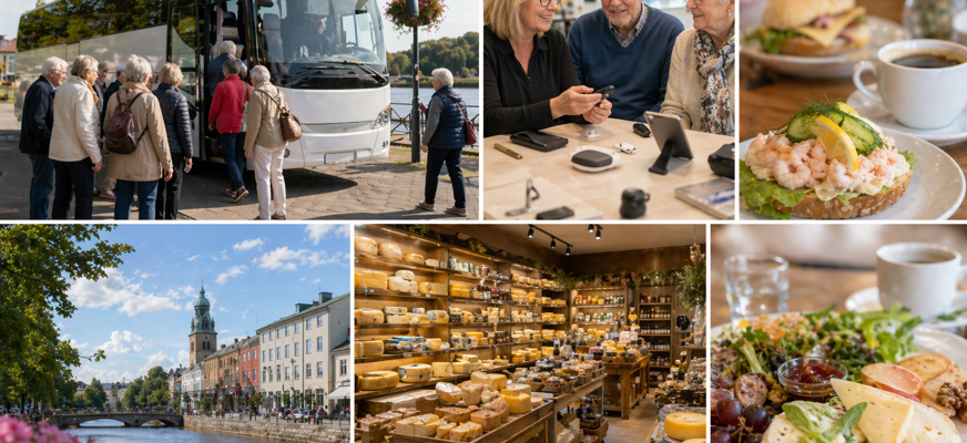 Vi får kaffe och smörgås på Simonsland. Här kan du välja mellan räksmörgås och ciabatta med ost och skinka. Uppge ditt val när du anmäler dig till resan! Buss från Borås avgår kl. 12.30 och vi är framme på Falbygdens ost ca kl. 13.30 Här kan vi handla bland 300 sorter ost och andra delikatesser i deras välsorterade butik. Här kan du också köpa lunch enligt menyn: