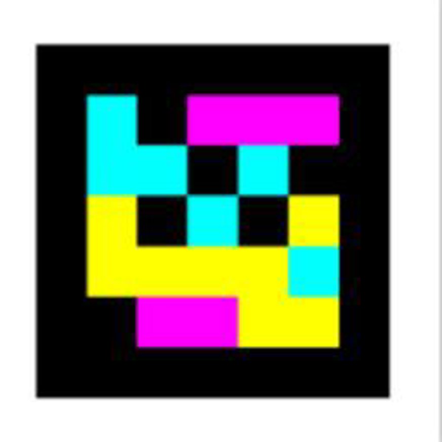 Bild på hur en QR-Kod kan se ut, ett speciellt mönster av färgglada fyrkanter i en stor svart fyrkant. Färgerna är förutom svart även rosa, turkos och gult i just denna QR-kod